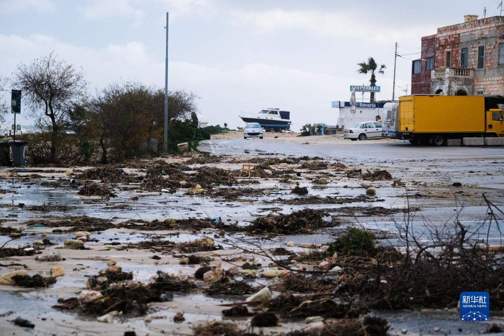 2月10日,在馬耳他納沙爾,風(fēng)暴過(guò)后道路堆滿(mǎn)垃圾。