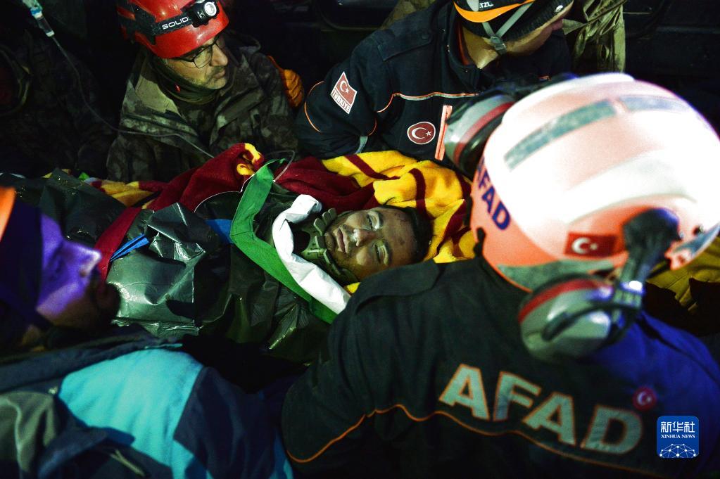 2月10日晚,在土耳其加濟安泰普省,救援人員轉移獲救的幸存者。
