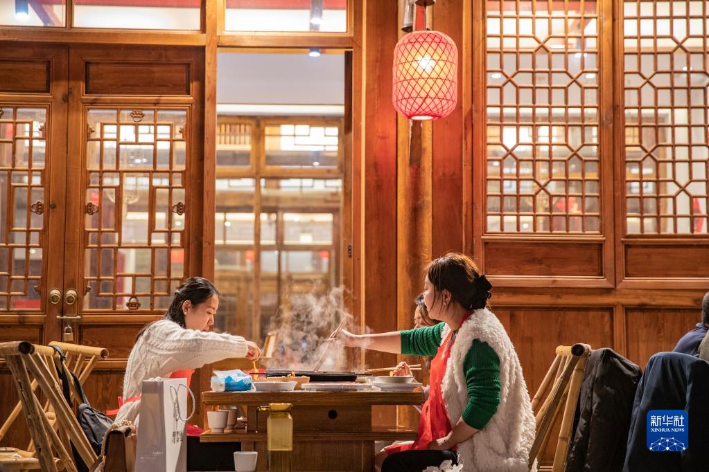2月10日晚,游客在位于重慶市渝中區的十八梯傳統風(fēng)貌區品嘗重慶火鍋。