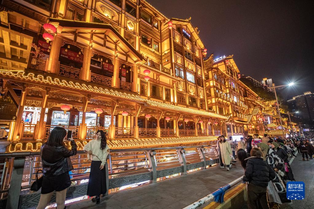 2月10日晚,游客在位于重慶市渝中區的洪崖洞街區游覽拍照。