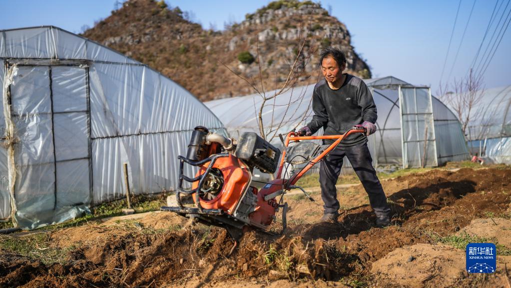 貴州六盤(pán)水市鐘山區中箐村村民駕駛小型翻耕機在田地里勞作(2月10日攝)。