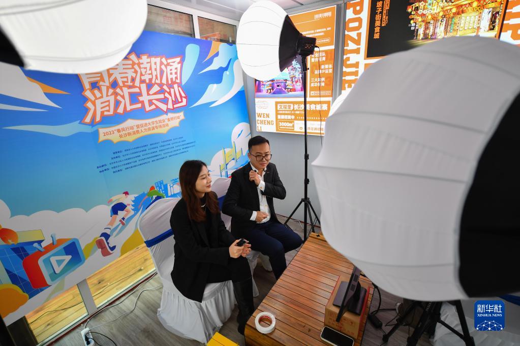 2月11日,在長(cháng)沙市天心區黃興南路步行街,工作人員在招聘活動(dòng)現場(chǎng)直播介紹崗位信息。