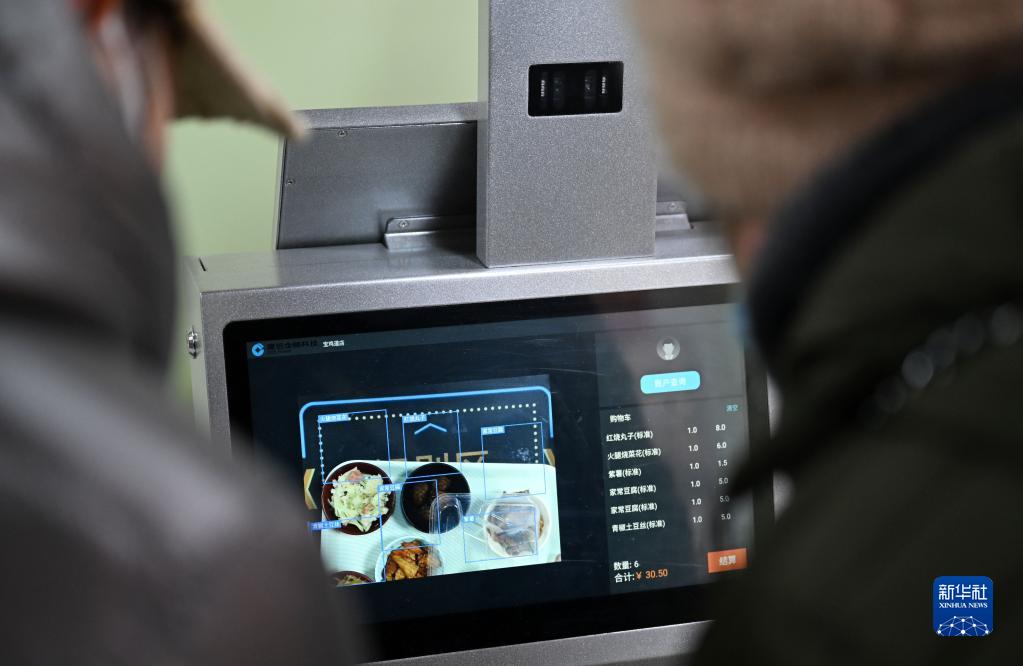 老人在天津市和平區南營(yíng)門(mén)街道的老年人“智慧食堂”通過(guò)視覺(jué)識別智慧取餐臺結算(2月10日攝)。