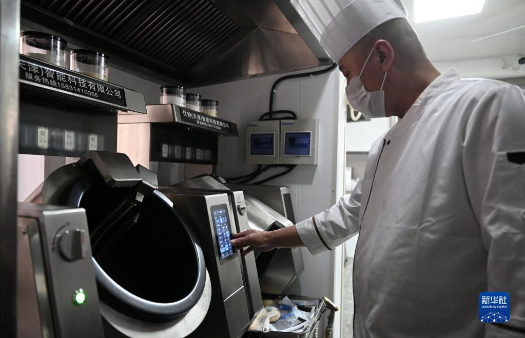 廚師在天津市和平區南營(yíng)門(mén)街道的老年人“智慧食堂”后廚操作炒菜機器人(2月10日攝)。