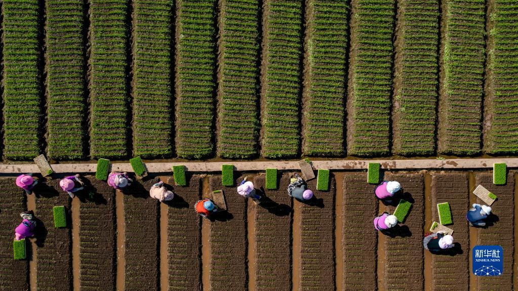 2月9日,在云南省玉溪市通??h秀山街道,農民在田間勞作(無(wú)人機照片)。