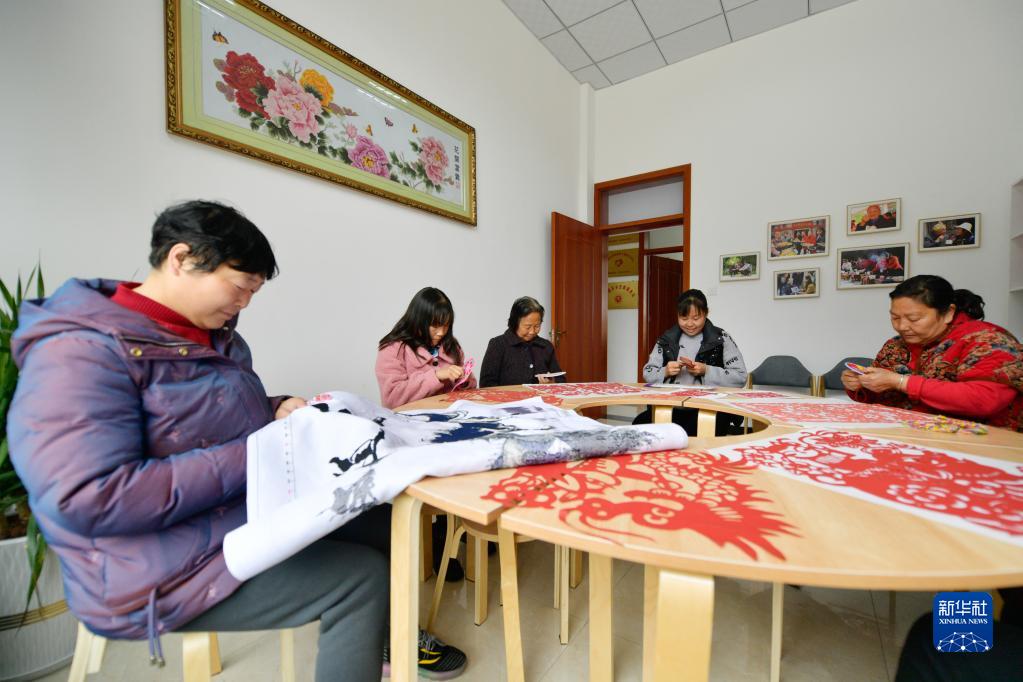 在隴南市徽縣虞關(guān)鄉許壩村“幸福家園”,婦女們在一起做手工(2月11日攝)。