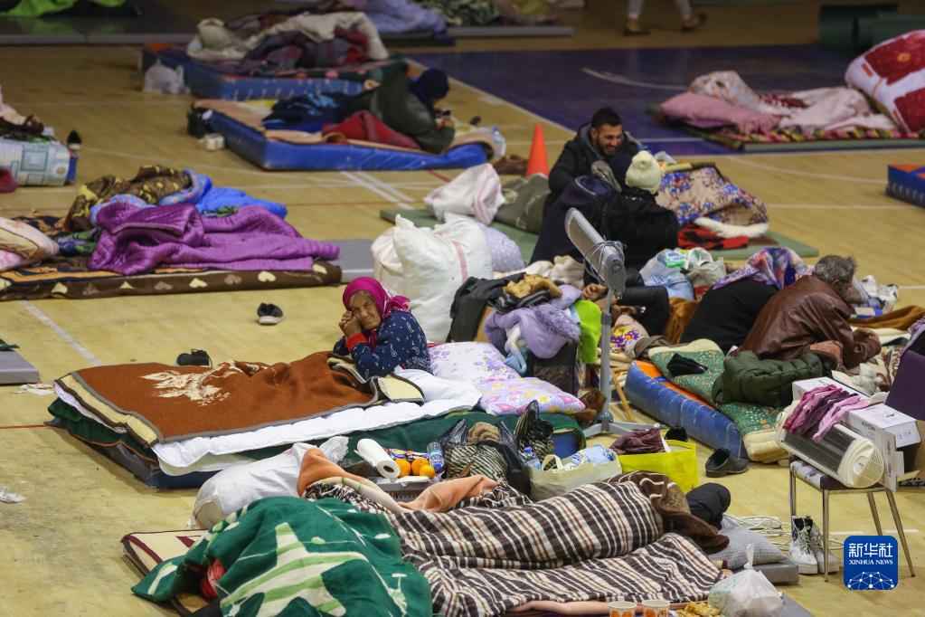 2月11日,受地震影響的人們在土耳其哈塔伊省安塔基亞市的一個(gè)體育館休息。