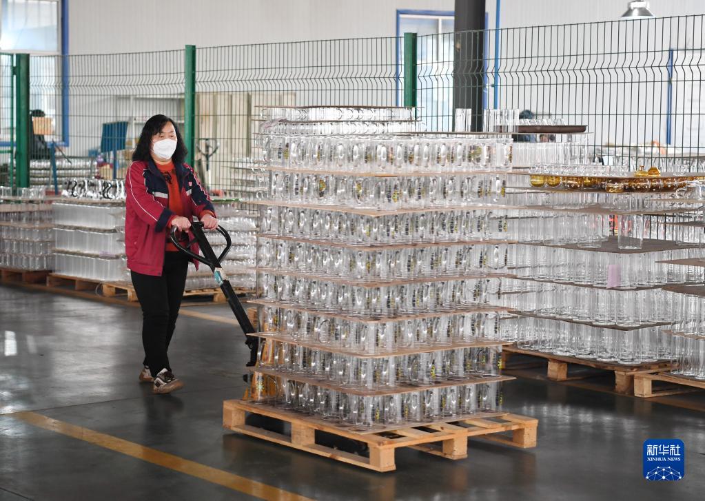 2月11日,河北省河間市一家工藝玻璃制品生產(chǎn)企業(yè)工人在車(chē)間內搬運產(chǎn)品。