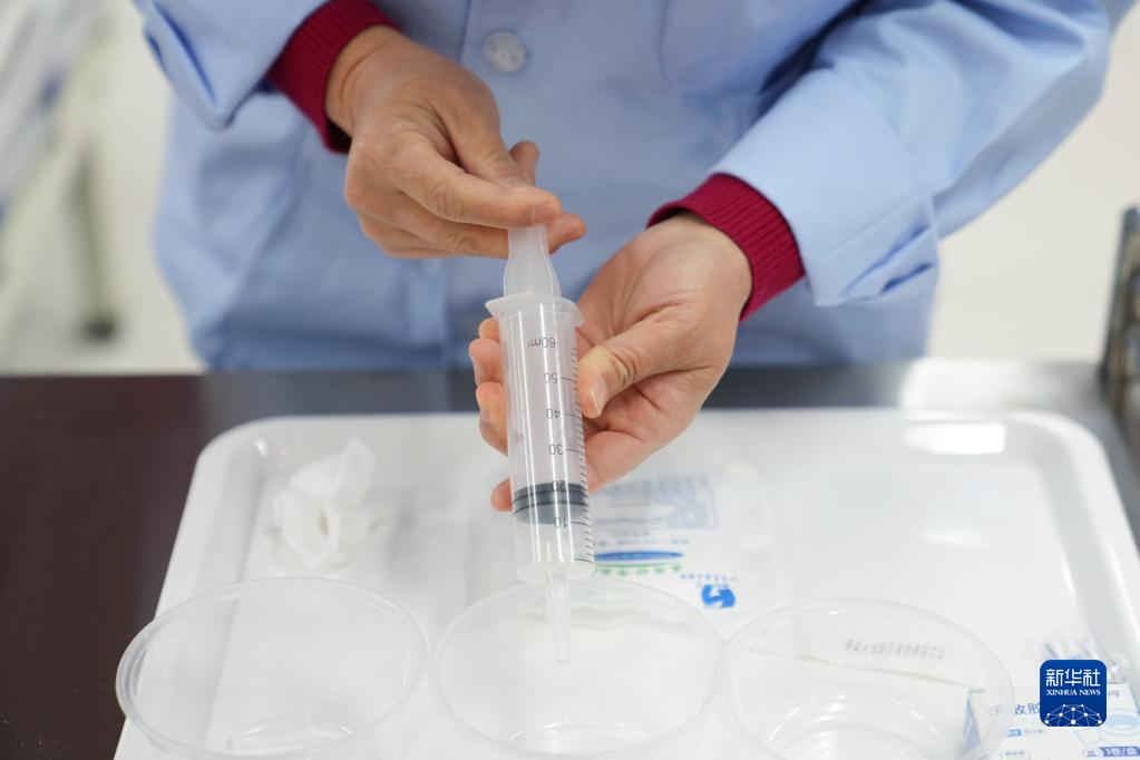 薛四四在北京市今日東方家政服務(wù)公司的護工崗前培訓上練習飲食照護操作(2月8日攝)。