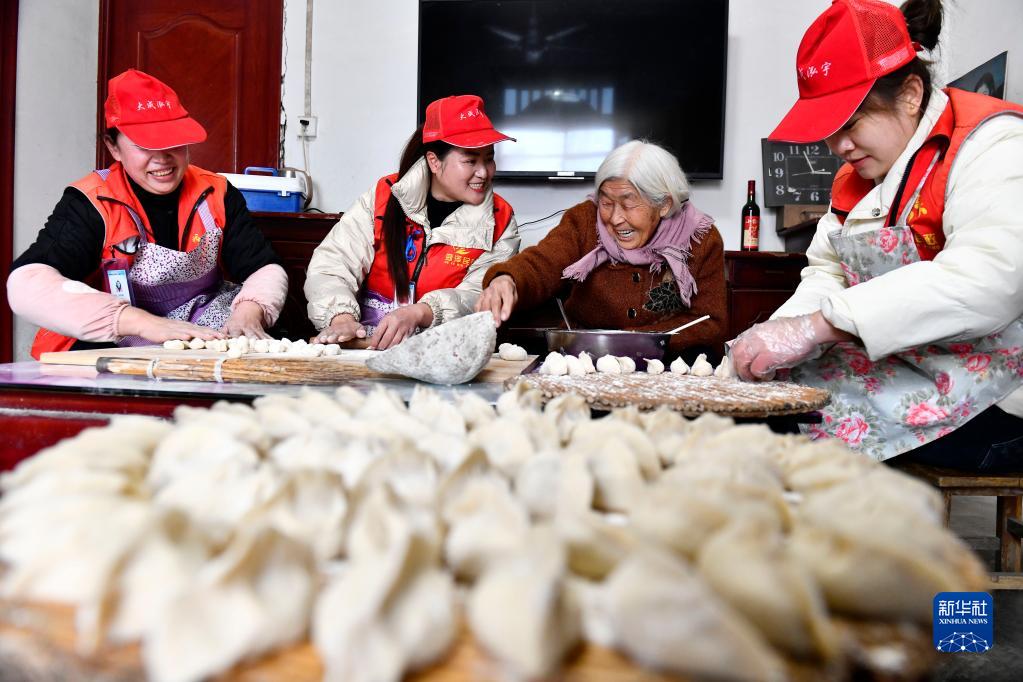 2月12日,在鄆城縣鄆州街道王沙灣村,鄆城縣居家養老服務(wù)中心的工作人員和魏金蘭(右二)老人一起包餃子。