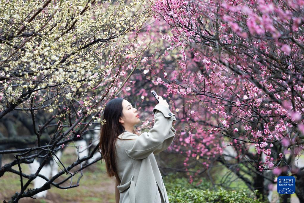 2月12日,游人在南京古林公園拍攝梅花。