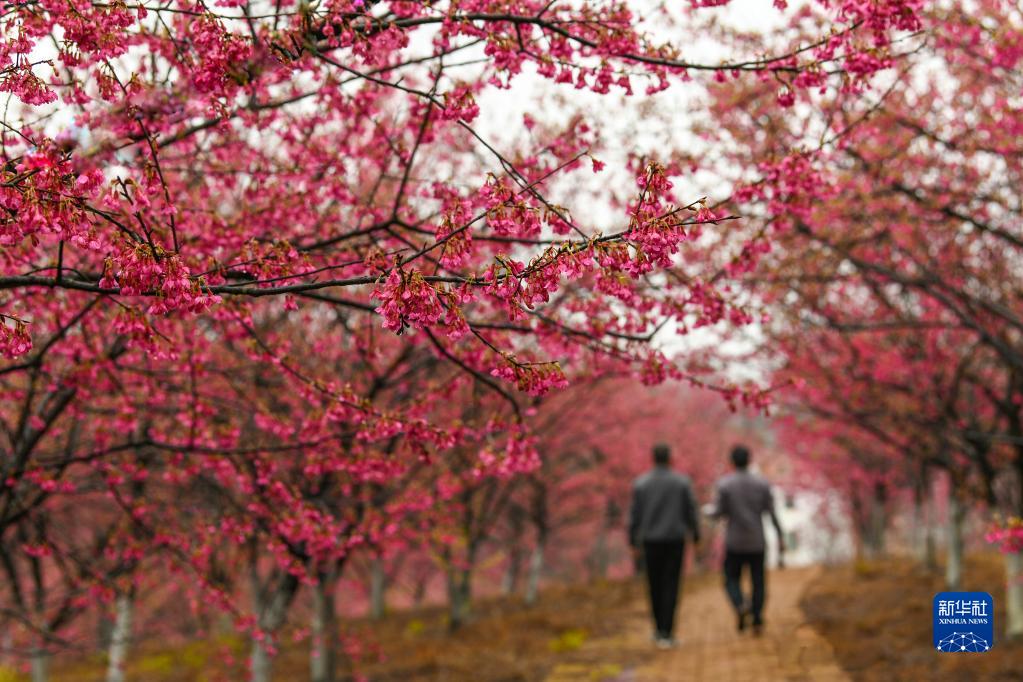 2月12日,游客在湖南省常寧市羅橋鎮廟山村櫻花園游覽。