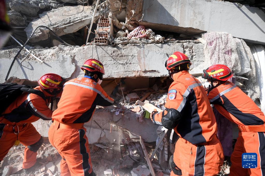 2月12日,中國救援隊隊員在土耳其哈塔伊省安塔基亞市一處地震廢墟開(kāi)展救援工作。
