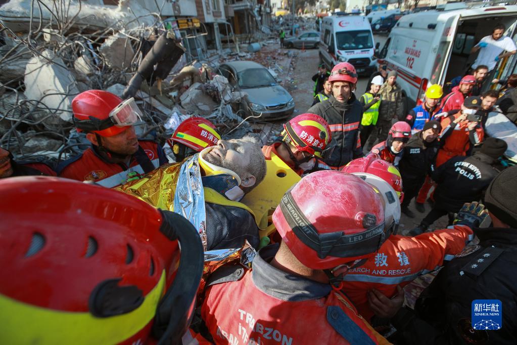 2月12日,在土耳其哈塔伊省安塔基亞市,中土兩國救援隊隊員轉移一名救出的幸存者。
