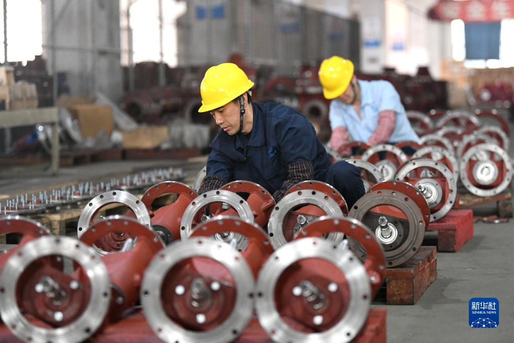 2月13日,工人在福建福州閩侯縣的毅飛泵業(yè)(福州) 有限公司生產(chǎn)線(xiàn)上組裝水泵部件。