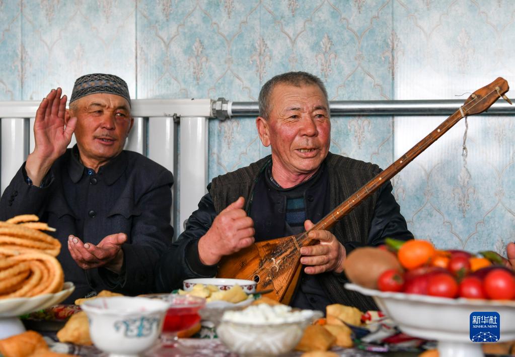 在一次鄰里聚會(huì )上,巴爾魯克山區牧民木拉提(右)即興彈唱歌曲,身邊的朋友沉醉其中,打著(zhù)節拍(2月12日攝)。