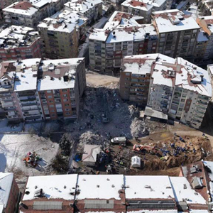 2月13日,在土耳其馬拉蒂亞,中國藍天救援隊隊員與當地救援人員在一處廢墟合作開(kāi)展地震救援工作。