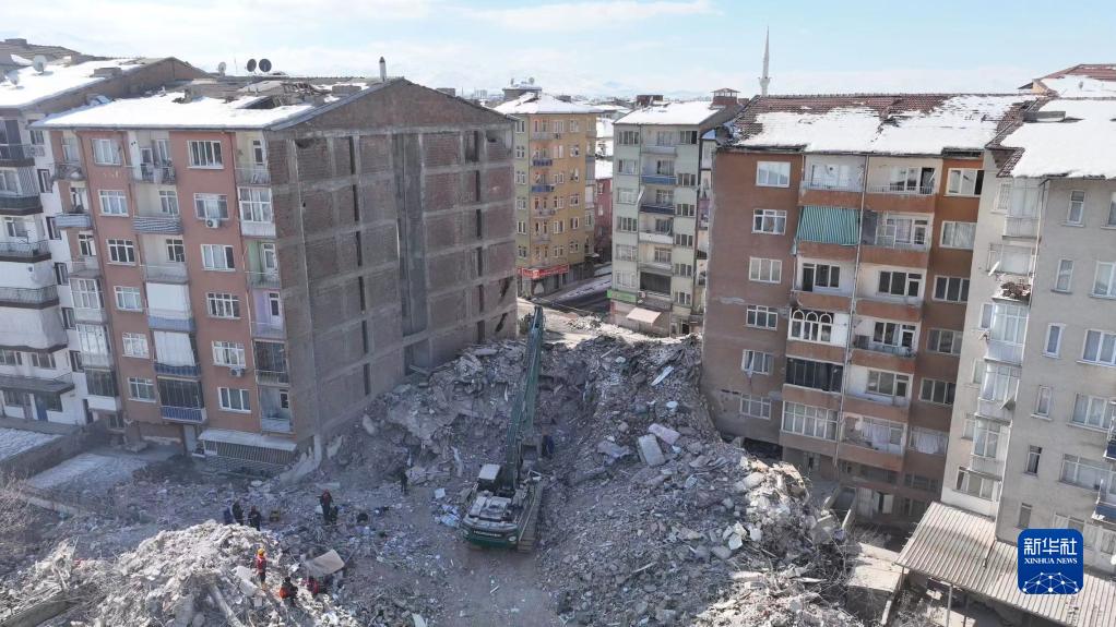 2月13日,在土耳其馬拉蒂亞,中國藍天救援隊隊員與當地救援人員在一處廢墟合作開(kāi)展地震救援工作。