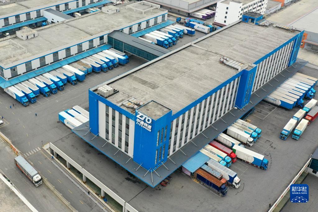 2月13日,快遞運送貨車(chē)??吭谫F州快遞物流園內(無(wú)人機照片)。
