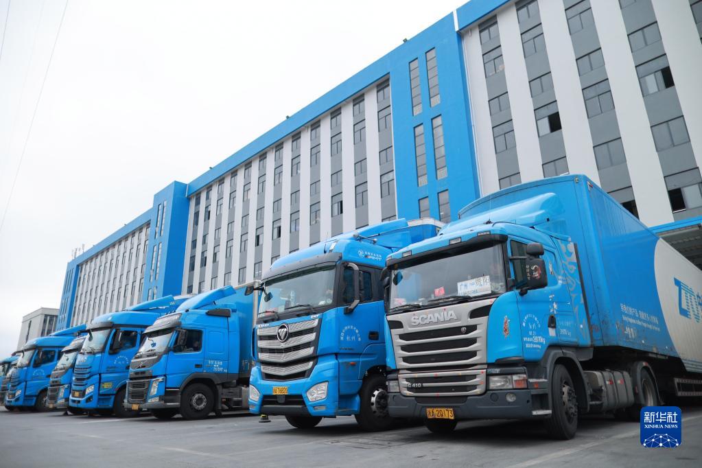2月13日,快遞運送貨車(chē)??吭谫F州快遞物流園內。