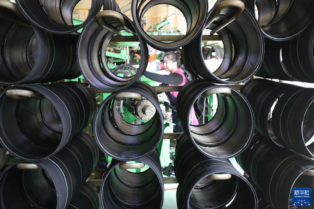 2月13日,山東省臨沂市沂南縣,一科技公司員工在生產(chǎn)出口東南亞的輪胎。
