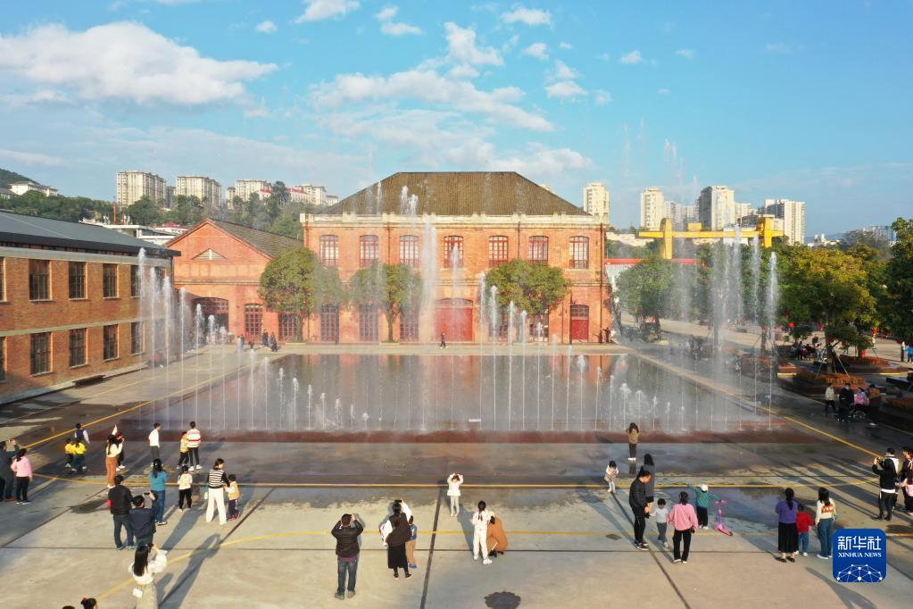 2月12日,游客在中國船政文化城核心區的“船政繪事院”前游玩(無(wú)人機照片)。