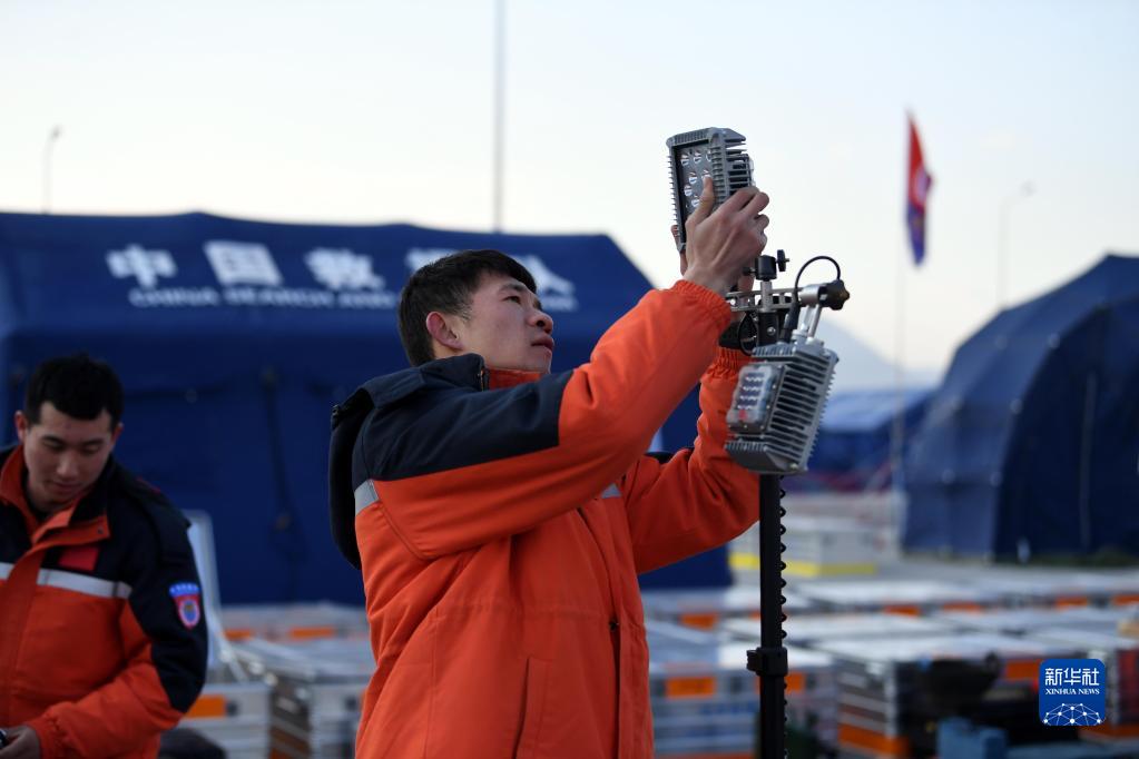 2月11日,在位于土耳其哈塔伊省哈塔伊體育館外的中國救援隊營(yíng)地,救援隊隊員檢查設備。