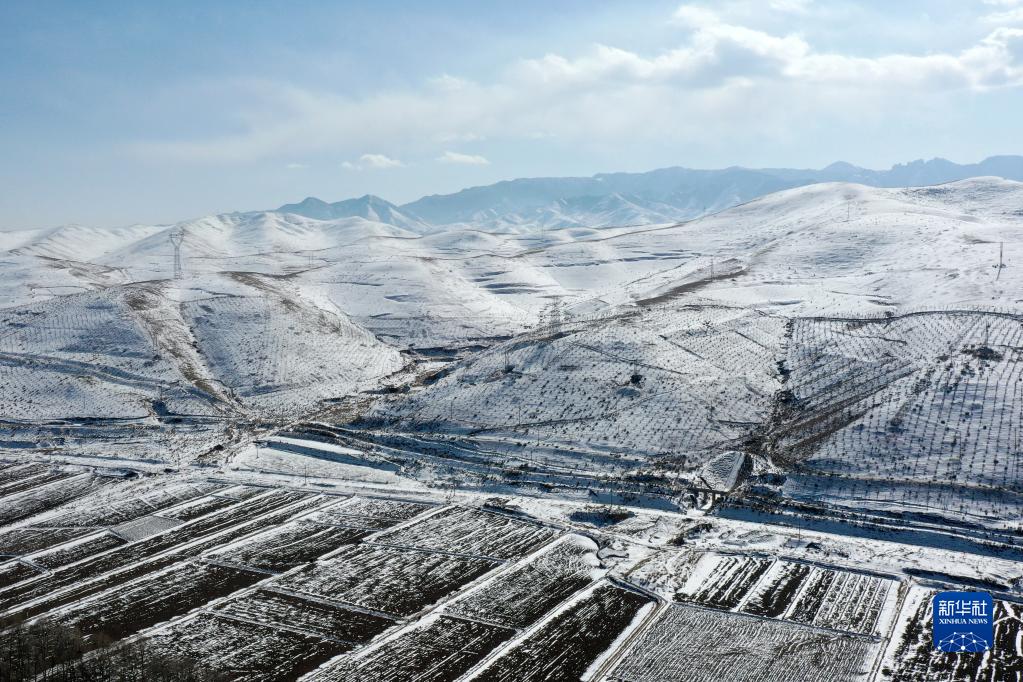 2月14日拍攝的烏鞘嶺及周邊雪景(無(wú)人機照片)。