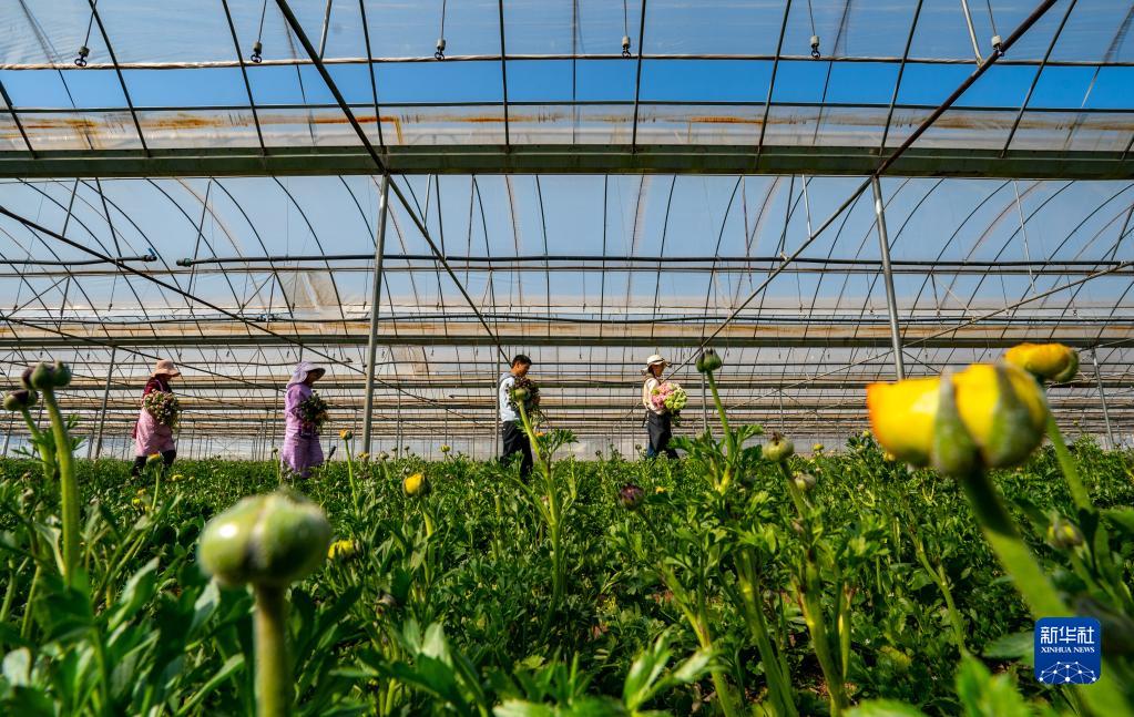 主播畢茜茜(右一)與家人抱著(zhù)剛采摘的鮮花準備進(jìn)行分揀包裝(2月12日攝)。
