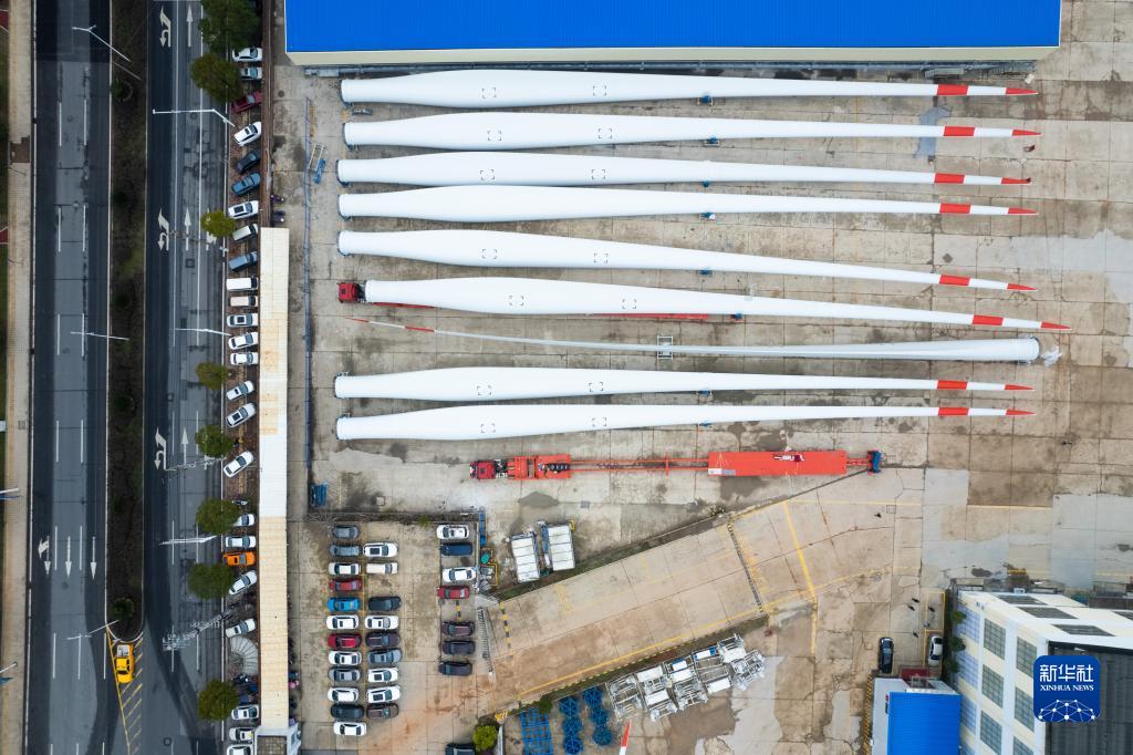 這是2月14日在株洲市淥口經(jīng)開(kāi)區灣塘工業(yè)園株洲時(shí)代新材料科技股份有限公司光明分公司拍攝的風(fēng)電葉片(無(wú)人機照片)。