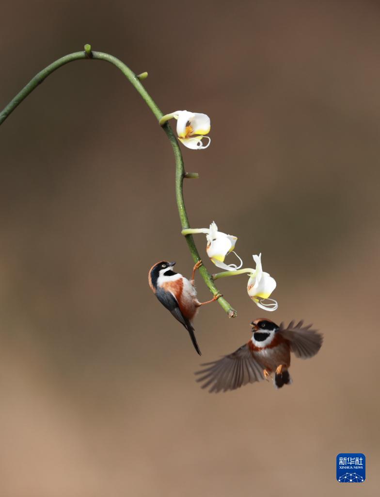 近日,江蘇鎮江西山水庫附近山花開(kāi)放,吸引紅頭長(cháng)尾山雀前來(lái)覓食小憩。