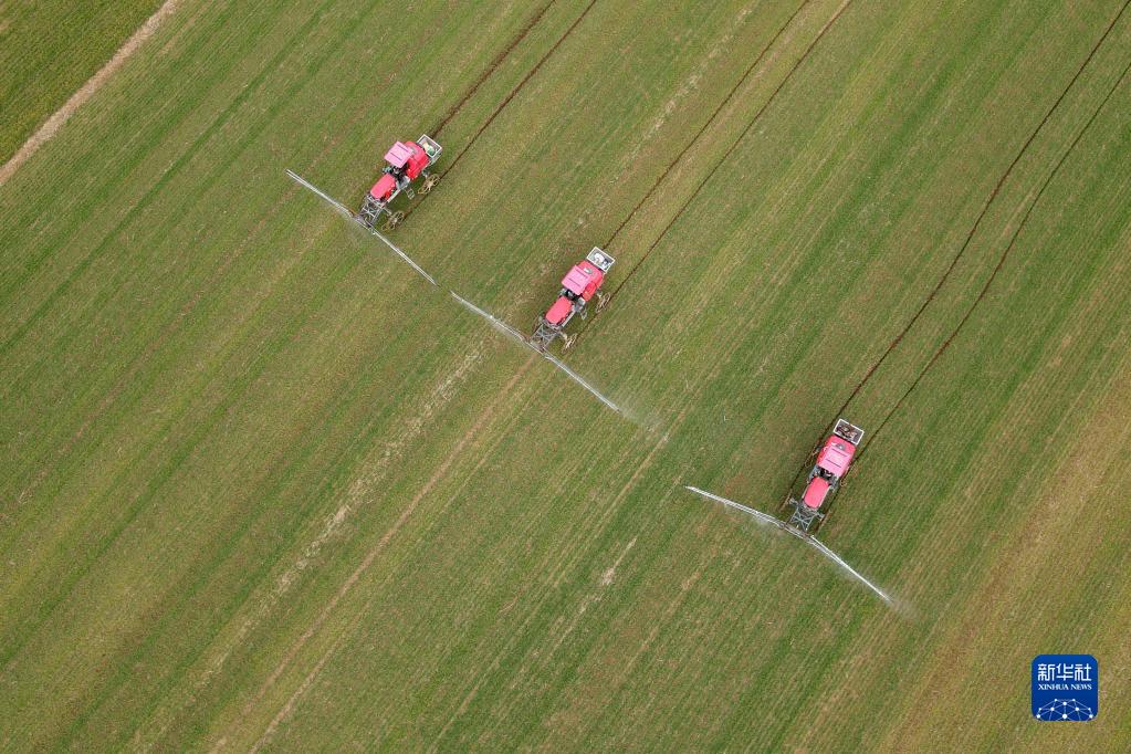2月14日,在安徽省蚌埠市五河縣頭鋪鎮,農民駕駛農機給小麥噴灑農藥(無(wú)人機照片)。