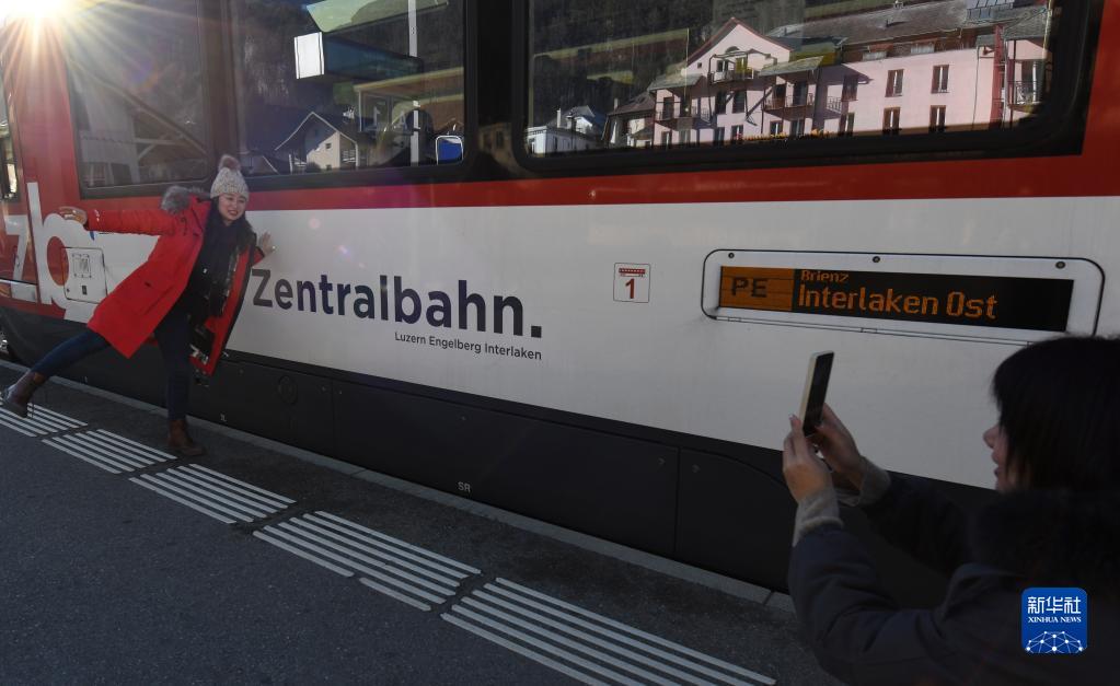 2月14日,中國游客在瑞士盧塞恩開(kāi)往因特拉肯地區的金色山口列車(chē)旁拍照留念。