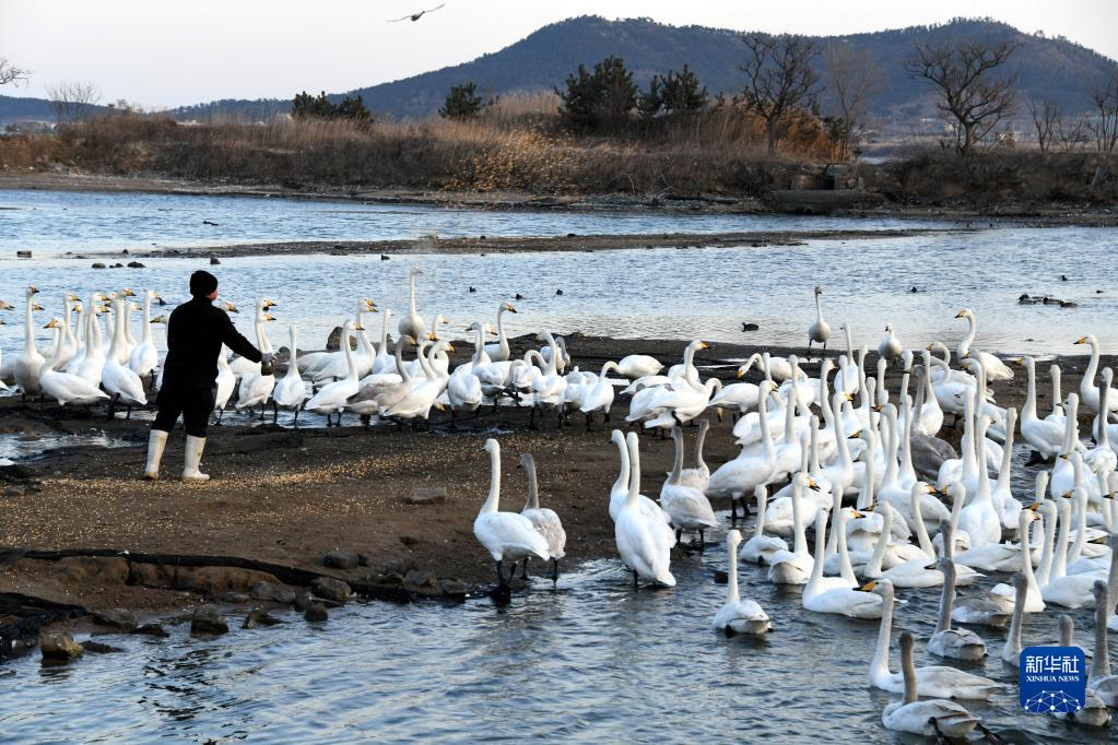榮成市大天鵝國家級自然保護區工作人員給大天鵝投放食物(2月14日攝)。