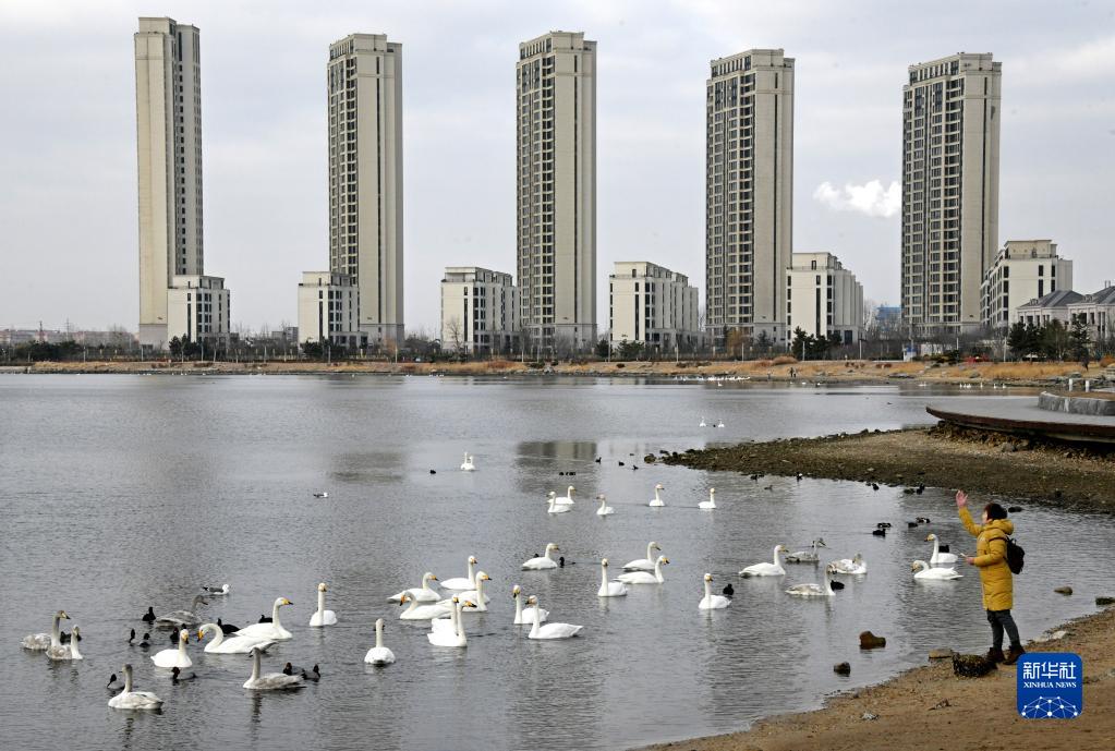 一位市民在榮成市崖頭街道櫻花湖畔給大天鵝喂食物(2月15日攝)。