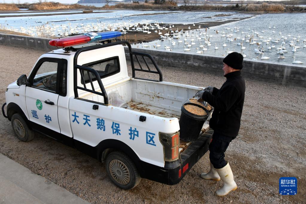 榮成市大天鵝國家級自然保護區工作人員任建平給大天鵝準備食物(2月14日攝)。