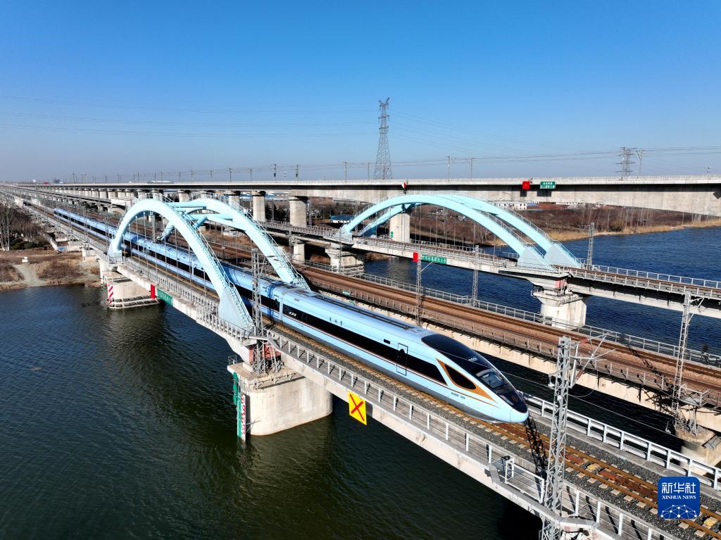 2月15日,列車(chē)駛過(guò)江蘇省連云港市海州區境內的一座鐵路橋(無(wú)人機照片)。