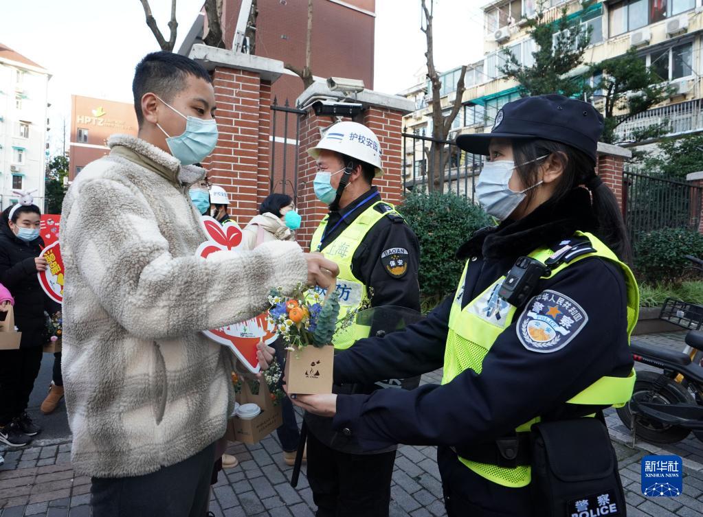 2月15日,黃浦區特殊教育職業(yè)學(xué)校的學(xué)生將咖啡與花贈送給護校警察。