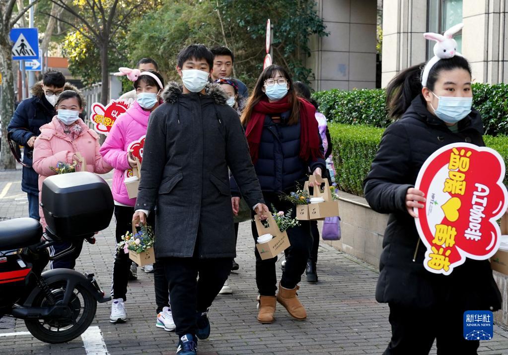 2月15日,黃浦區特殊教育職業(yè)學(xué)校的學(xué)生提著(zhù)咖啡與花走出校門(mén)。