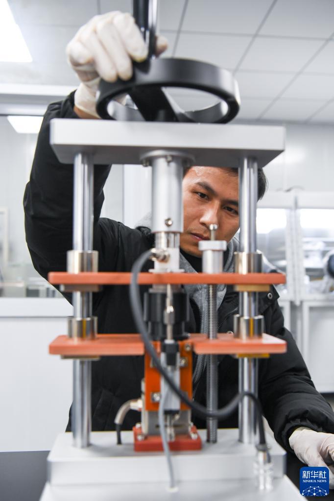 江蘇杉元科技有限公司的工作人員在檢測石墨烯粉體導電性(2月14日攝)。