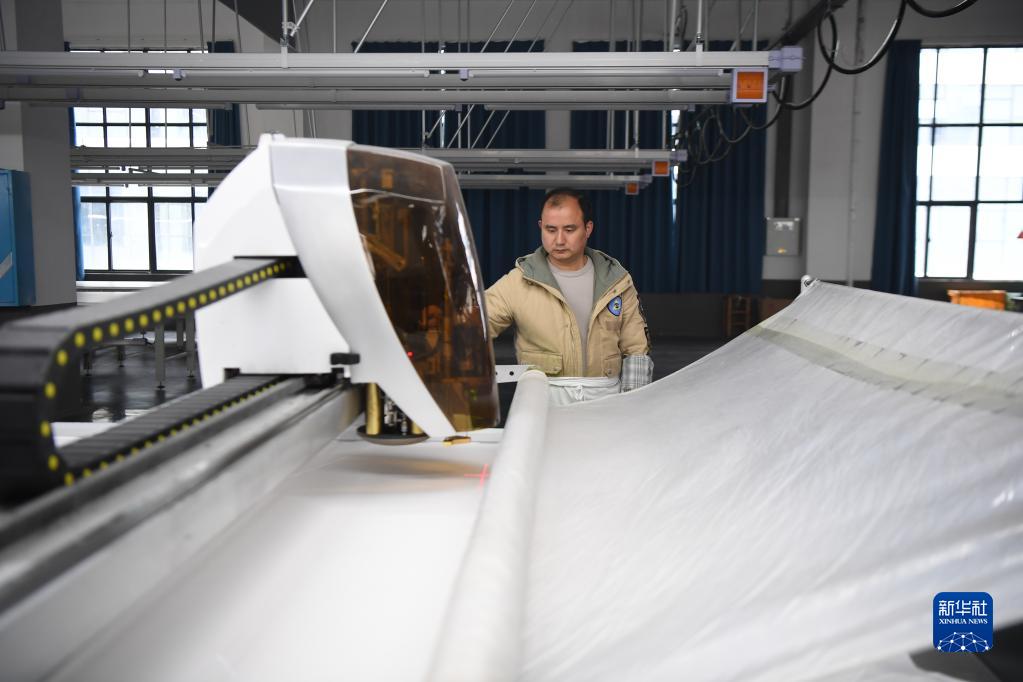 2月15日,工人在湖南尊睿服飾有限公司操作自動(dòng)裁床,自動(dòng)裁床可根據圖紙精準裁剪布料。