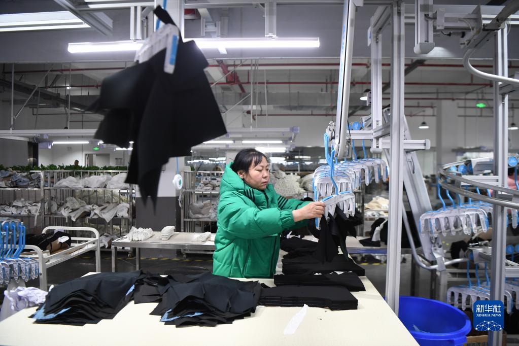 2月15日,工人在湖南尊睿服飾有限公司將裁片掛上自動(dòng)吊掛系統。自動(dòng)吊掛系統可自動(dòng)將裁片送往下一道工序。