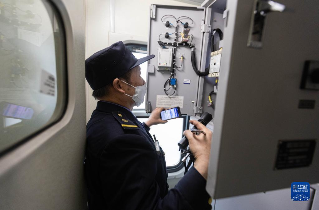 2月13日,車(chē)輛乘務(wù)員李金文在列車(chē)上檢查車(chē)廂的配電箱。