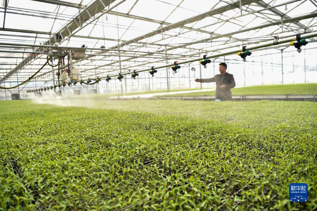 2月15日,在貴州省榕江縣車(chē)江壩區智能化育苗中心大棚,農技人員觀(guān)察自動(dòng)噴淋系統澆水情況。