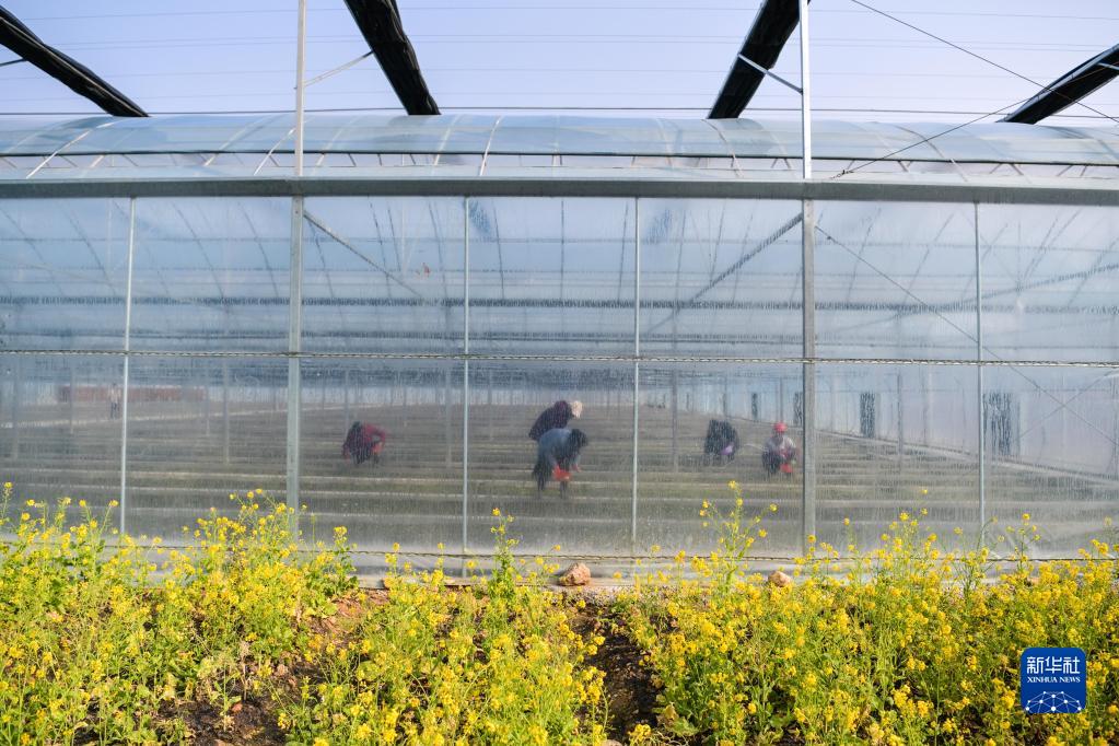2月15日,工人在貴州省從江縣貫洞鎮淫羊藿育苗基地的溫室大棚里管護淫羊藿苗。