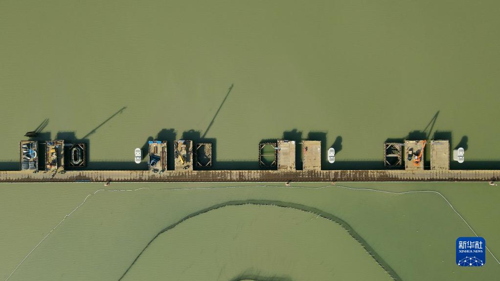 這是2月15日拍攝的合新鐵路安徽段懷洪新河特大橋跨沱湖水中墩施工現場(chǎng)(無(wú)人機照片)。