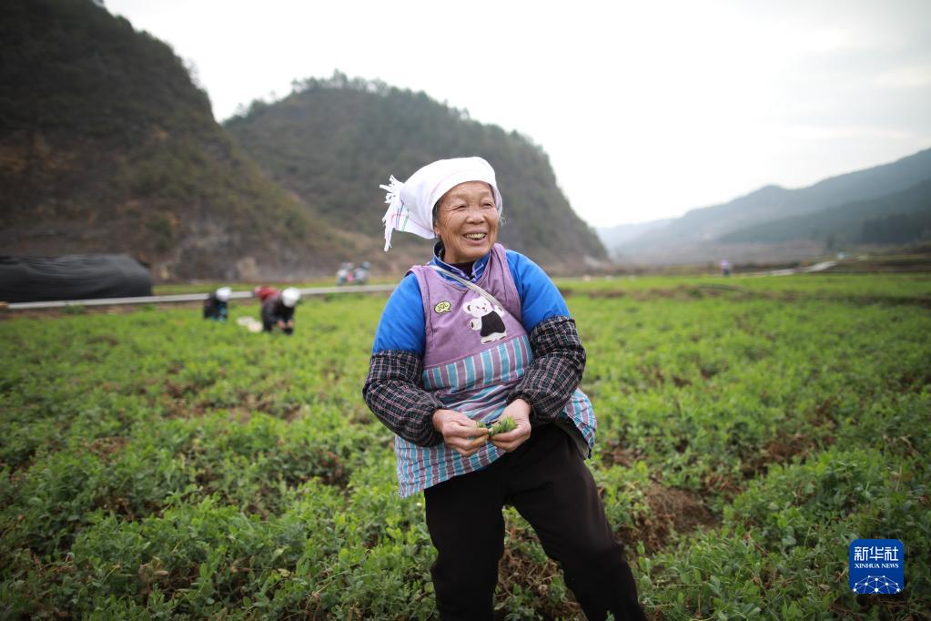 2月15日,在龍里縣灣灘河鎮郊外,菜農在采摘豌豆尖。