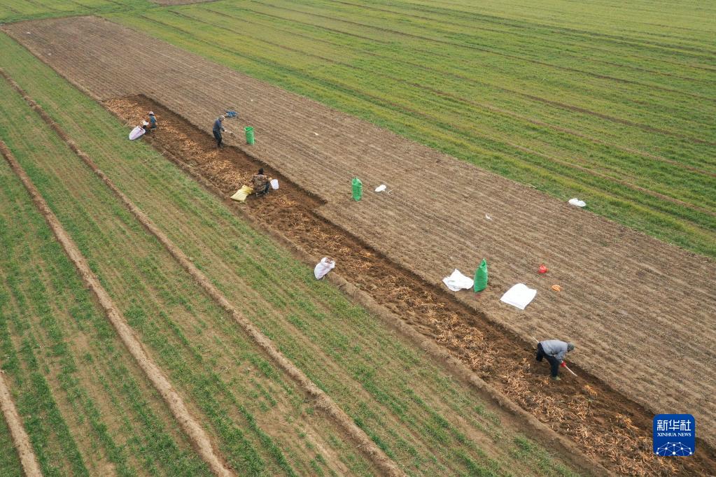 2月15日,河南省焦作市溫縣祥云鎮蘇莊村農民在田間采收懷地黃(無(wú)人機照片)。