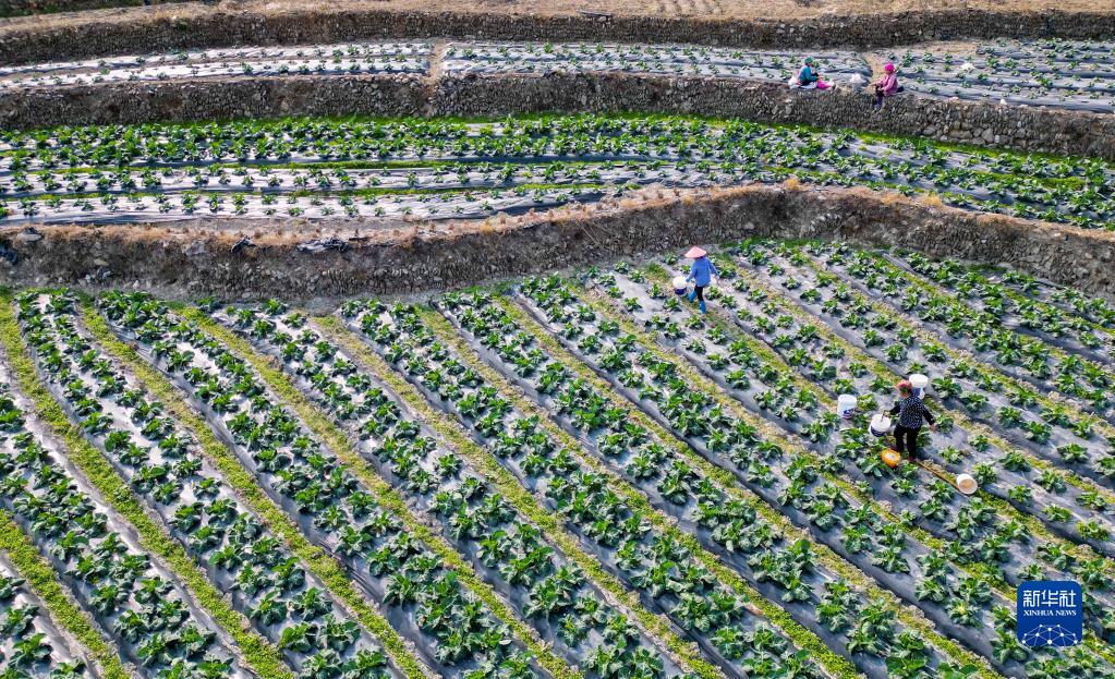 2月15日,村民在貴州省從江縣洛香鎮上皮林村田間管護蔬菜(無(wú)人機照片)。