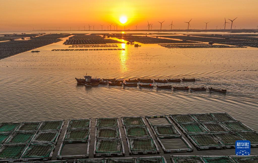 2月16日,在榮成市石島管理區桑溝灣海洋牧場(chǎng)網(wǎng)箱養殖區,漁民駕駛漁船出海作業(yè)(無(wú)人機照片)。